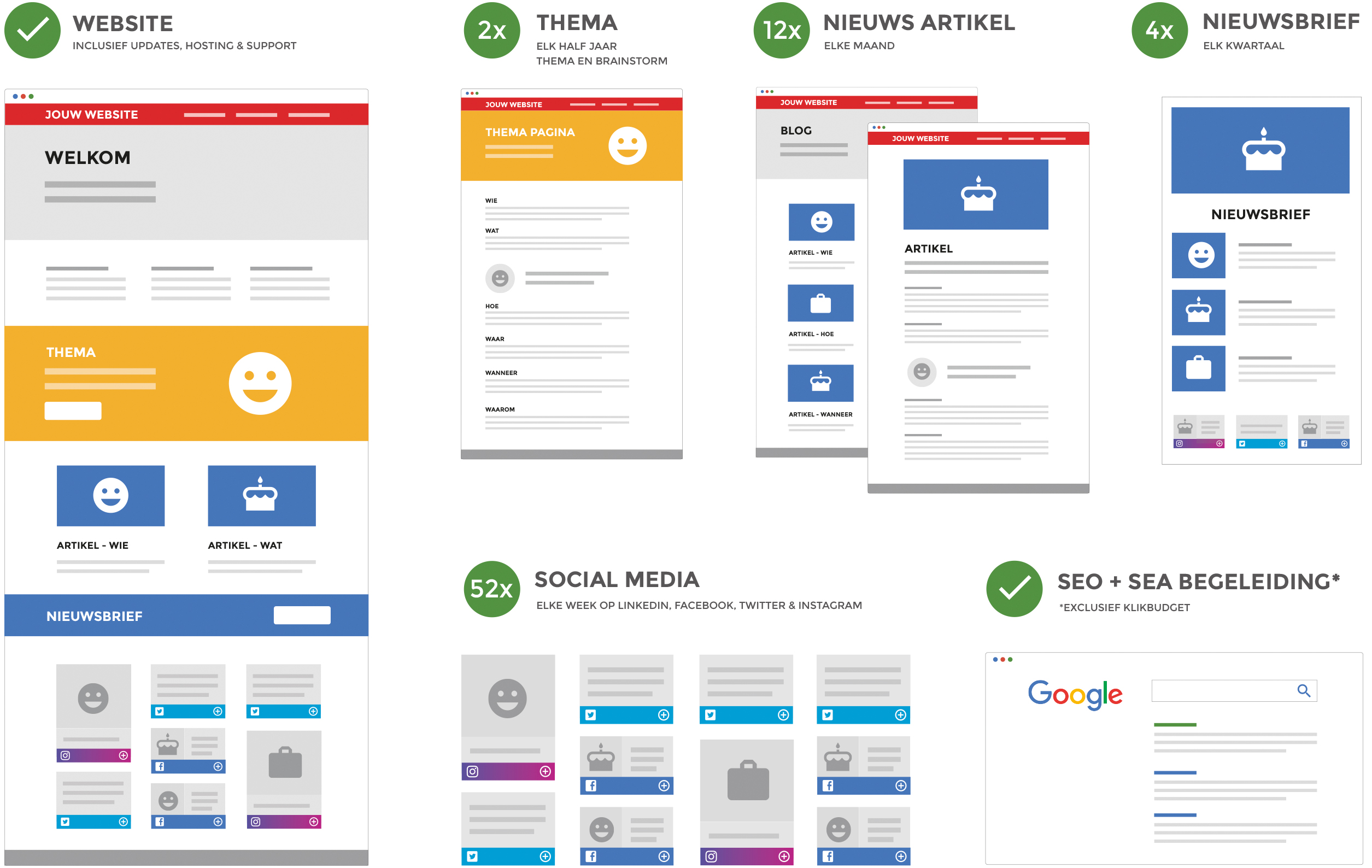 Online marketing vraagt om structurele inzet op topniveau. Alles begint bij het unieke verhaal van het bedrijf. Door middel van een persoonlijke brainstorm komt dit verhaal naar boven. Spredle maakt scherpe teksten en professionele foto’s en verspreidt vervolgens periodiek het verhaal van de onderneming via blogartikelen, nieuwsbrieven en de meest gebruikte socialmedia-kanalen. Dit herhalen we periodiek voor minimaal een jaar. Door deze heldere propositie en professionele ondersteuning biedt Spredle een doordachte online marketingaanpak die lokale ondernemers en MKB’ers ontzorgt op weg naar een complete online marketing oplossing.